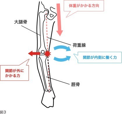原因としては様々ですが、本来であれば右図の赤い斜めの点線が膝の真ん中を通る事が理想です。