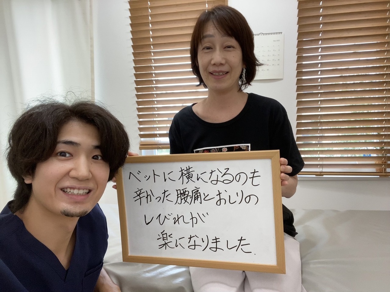 腰の痛みがお尻にまで来て、ベットに横になるのも辛い状態でしたが、数回通った頃から辛い痛みがなくなり、首と肩も楽になってきました。